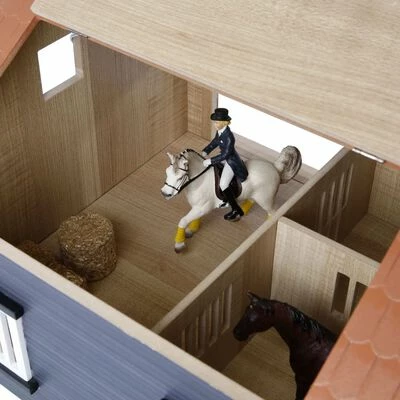Mesurant 51 x 40,5 x 27,5 cm (l x P x H), ces écuries sont répliquées à une échelle de 1:24 et conçues avec 2 compartiments pour chevaux et un atelier.