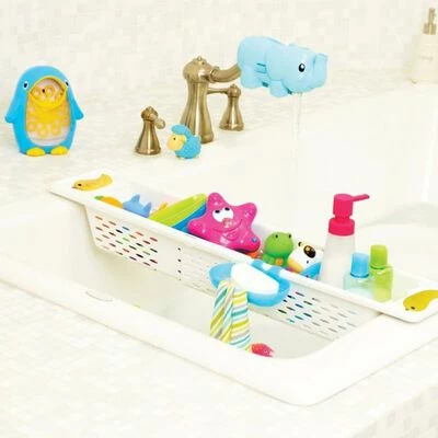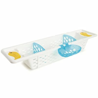 Ce support pratique s’étend pour s’adapter à travers la baignoire (jusqu’à 79 cm) pour tenir les jouets de bain et les articles essentiels à portée de main tout en créant une barrière entre le bébé et le bec. Les poignées Xtra peuvent maintenir le support en sécurité sur le rebord de la baignoire sans ventouses. Le support organise les jouets et les articles de toilette essentiels pour que vos enfants puissent saisir ce qu’ils veulent et même aider à nettoyer lorsque l’heure du bain est terminée. Grâce aux multiples trous de drainage, tout sèche rapidement, évitant la moisissure dans les jouets de bain.