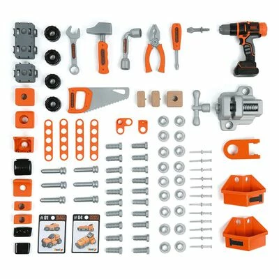 Caractérisé par des couleurs vives et des fonctions attrayantes, le fantastique ensemble de jeu d’établi est livré avec des outils réalistes, tels qu’un tournevis, une scie, une pince, une clé à tube, un marteau et une clé. La scie circulaire mécanique avec son permet au jeune bricoleur de découper les pièces en plastique d’imitation de bois. Le pistolet à vis mécanique sans fil permet d’assembler toutes sortes de véhicules à partir des composants de construction. Grâce à l’espace de rangement, aux grands et petits compartiments de rangement et à la planche à outils, ce banc à outils jouet dispose d’un grand espace de travail pour ranger tous les mini-outils et les accessoires. Pendant le jeu, vos enfants doivent affronter des choses comme la coordination d’équipe, la communication et apprendront tout sur les outils.