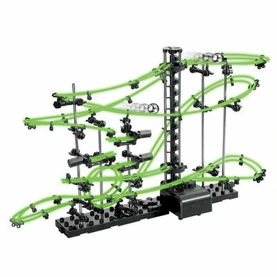 Avec une vitesse spectaculaire, les billes d’acier parcourent les pistes le long de courbes serrées et d’une boucle. Ensuite, elles montent à l’ascenseur qui les ramène pour le prochain tour. Ce kit de piste à billes a deux pistes distinctes, des sections de cascade et est également brillant dans le noir. Les billes d’acier suivent une piste et se terminent après une boucle palpitante en bas.