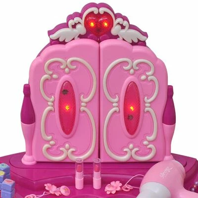 Votre petit passionné de maquillage ou votre coiffeur peut se préparer en utilisant le comptoir cosmétique en plastique incassable, sûr et fonctionnel. La coiffeuse est équipée d’éclairages à boutons et à batterie pour éclairer le miroir stylé. Lorsque vous appuyez sur le bouton en forme de cœur situé en haut, les murs du miroir s’ouvrent, la musique est jouée et l’éclairage du cadre du miroir commence à s’allumer. De plus, la jolie soufflerie fonctionne comme une vraie ! Il y a un tiroir coulissant dans le bureau pour organiser les fournitures de beauté inclus. Sa construction robuste le rend durable et facile à nettoyer.